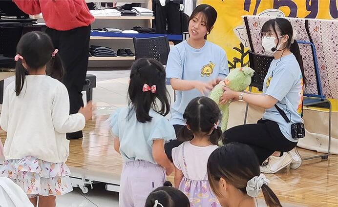 2025年8月22日(金)、ヒューマンケア学部幼児保育専攻のボランティアサークル【はっぴぃらいおん】がイオンモールナゴヤドーム前にて、「大型布芝居」と手遊び・リズム体操を実践しました。