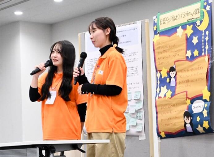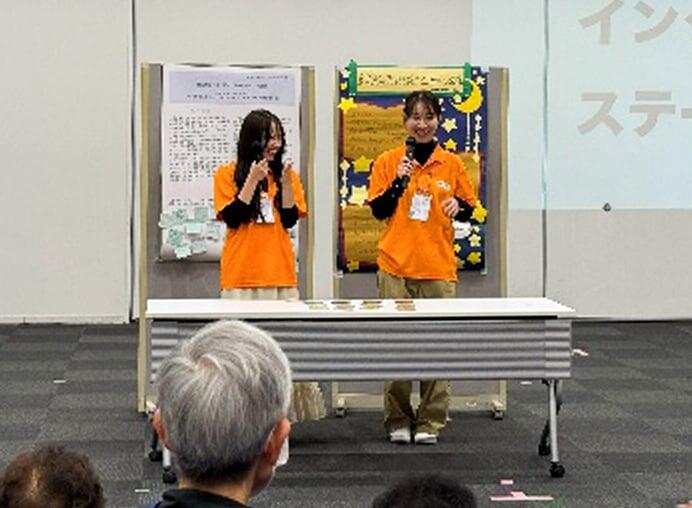 ポスター発表のテーマは「創造的な対話を促す『企画ゲーム』の提案」。学生たちが授業での体験をもとに、参加者と企画を考えるゲームを提案し、ブースで実践しました。最後に、ステージにて参加者と考えた企画を発表しました。