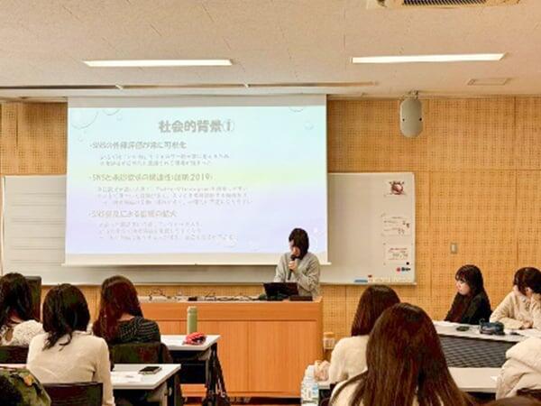 ヒューマンケア学部子どもケア学科の学生は、3年生後期から4年生後期まで、各専攻の「ゼミナール」に所属します。少人数のゼミナール活動を通して、自ら興味のあるテーマについて探究し、最終的には卒業研究として論文や作品にまとめ、成果を発表します。