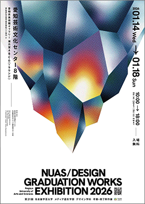 第21回卒業・修了制作展を、2026年1月14日(水)~1月18日(日)に愛知県美術館ギャラリーにて開催いたします。 デザイン学科長より本年も、名古屋学芸大学メディア造形学部デザイン学科において「卒業・修了制作展」を開催する運びとなりました。学生たちが取り組んできた卒業研究・制作の成果を公開できることを、学生・教職員一同うれしく思っております。 学生の研究テーマや制作内容は多岐にわたります。そこに込められた思考や姿勢を含め、作品をご覧いただけましたら幸いです。ご意見やご感想を頂戴できれば、学生にとって大きな励みとなります。 これからのデザイン領域を担う若い世代の表現や熱意に触れていただけますよう、ご案内申し上げます。 卒業・修了制作展 運営学生代表より私たちにとって、デザインを学んだ4年間はあっという間でしたが、その中には確かな経験の積み重ねがありました。デザインの探究や表現の試行を繰り返す中で、課題に向き合う力を磨きながら、それぞれの方法で形にしてきました。 私たちの試みは、ここで終わりではありません。これまで培ってきた経験の結晶は、次の挑戦へと続き、より一層研ぎ澄 まされていきます。 第21回名古屋学芸大学デザイン学科卒業・修了制作展のビジュアルコンセプトは「つづく」です。出展者98名の積み重ねてきた次へ向かう小さな輝きの欠片を、ぜひ会場にてご覧いただき、私たちのデザインへの考えや表現に対してご講評いただけると幸いです。 卒業・修了制作展は集大成ともいうべき展覧会です。学生たちの真摯な取り組みの成果をご高覧いただければ幸いです。 展覧会ビジュアルのコンセプト「つづく」 名古屋学芸大学デザイン学科 第21回卒業・修了制作展