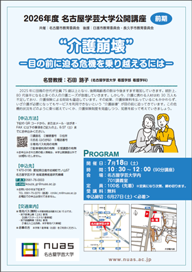 名古屋学芸大学では、2026年度前期公開講座を以下の日程で開催いたします。 対面形式のみでの実施となります。皆さまのご参加を心よりお待ちしております。 2026年度 名古屋学芸大学 公開講座(前期)